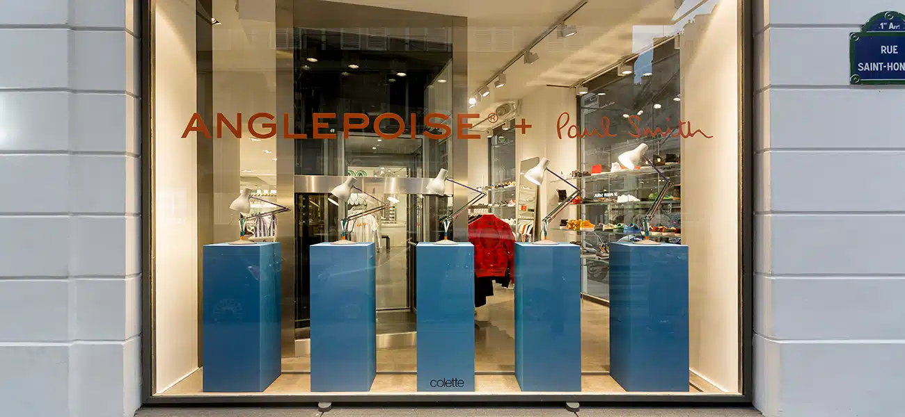 Dedicated window display for the launch of the Anglepoise + Paul Smith Edition Two lamp at cult Parisian store Colette, which shut its doors in December 2017.