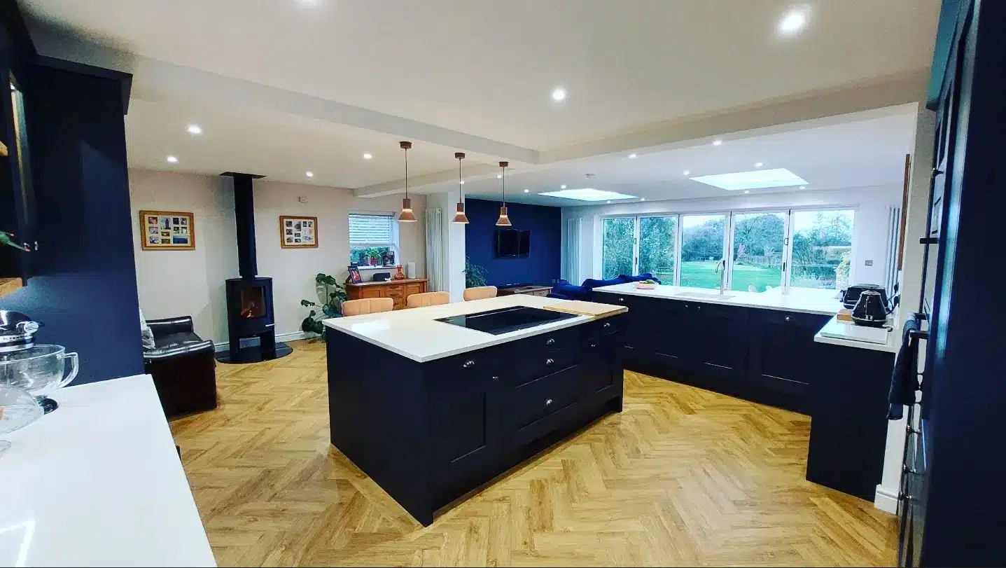 Our hearts skipped a beat when we saw this gorgeous extension featuring our Type 80 pendant lights in Rose Pink. They’re a perfect match for the blush pink velvet bar stools, and really pop against the deep navy paintwork.