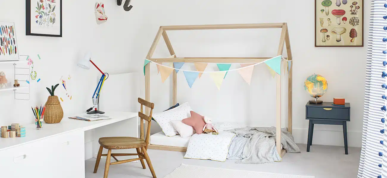 Two of Anglepoise’s colourful collaborations with legendary British designers Paul Smith and Margaret Howell were used in the space.A Type 75 Mini in the Paul Smith Edition Three colours is displayed in the children’s bedroom, and the Type 75 Seagrass Edition of the Margaret Howell collection complements the bright and airy living room space.